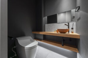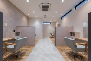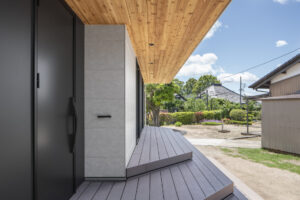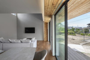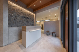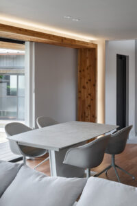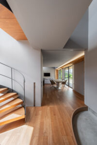 通りに面して開口を減らし、閉鎖的な印象ですが、玄関を開けると、正面に中庭が広がる開放感のある空間が広がっています。内部は、中庭に面して開口を設け、棟ごとに階数を変えたことで、両棟に光が降り注ぐような明るい空間を叶えました。また、LDKとご家族だけが使用するプライベートルームを離す回廊プランにしたことで、ゲストが来訪しても生活感を感じさせない造りに。ご家族だけの時間も、ゲストの来訪時でも、心ゆくまでゆったりと楽しめる住まいになりました。