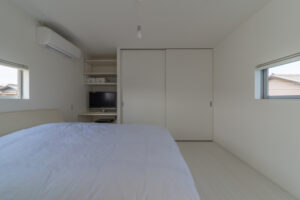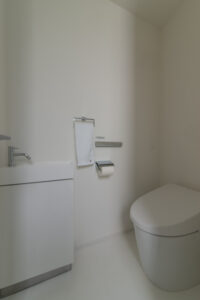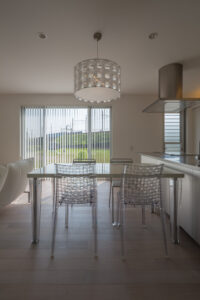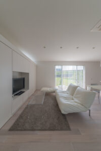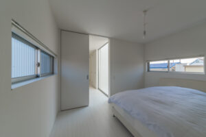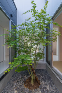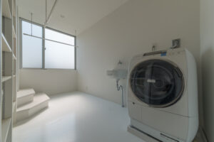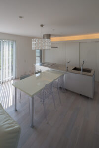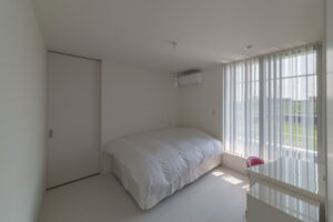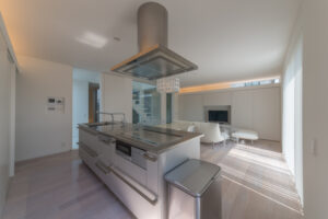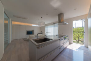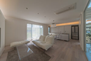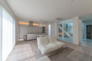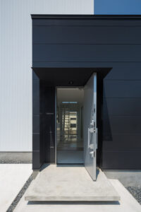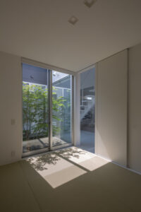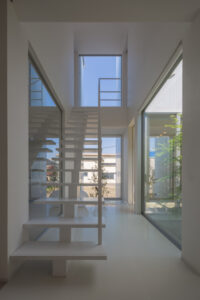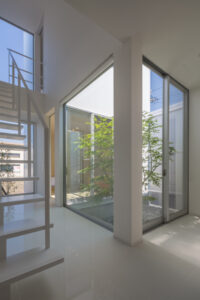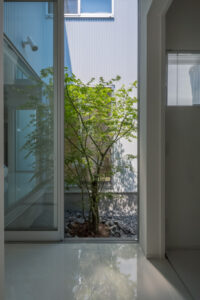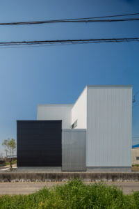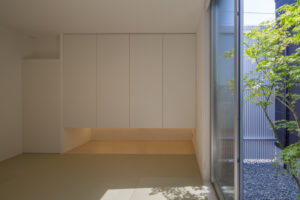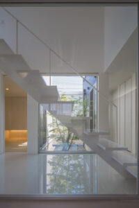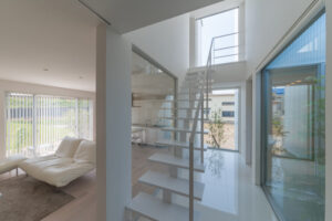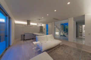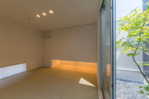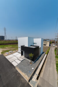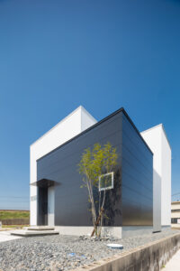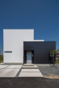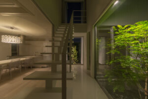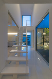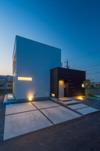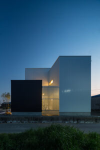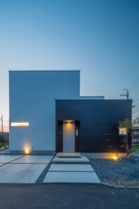 無彩色・透明感にこだわった、「非日常」がテーマの住宅です。 昼と夜で異なる表情を見せる、白と黒の箱を組み合わせた外観。内部は生活感を排除したギャラリーのような空間に坪庭の木々が彩りを加えます。計算された大開口部とガラスの大胆な使用により、面積以上の広がりが感じられます。開放感を内包しつつシンプルを極めた凛とした住宅となりました。